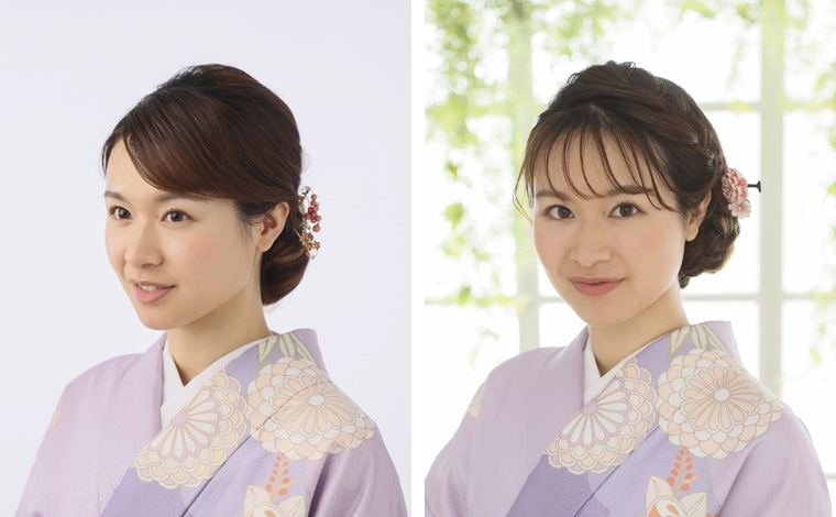 着物によく似合う高い位置のアップスタイルも、カールをまとめたりボリュームを出したり、アレンジの幅が広いヘアスタイルです。