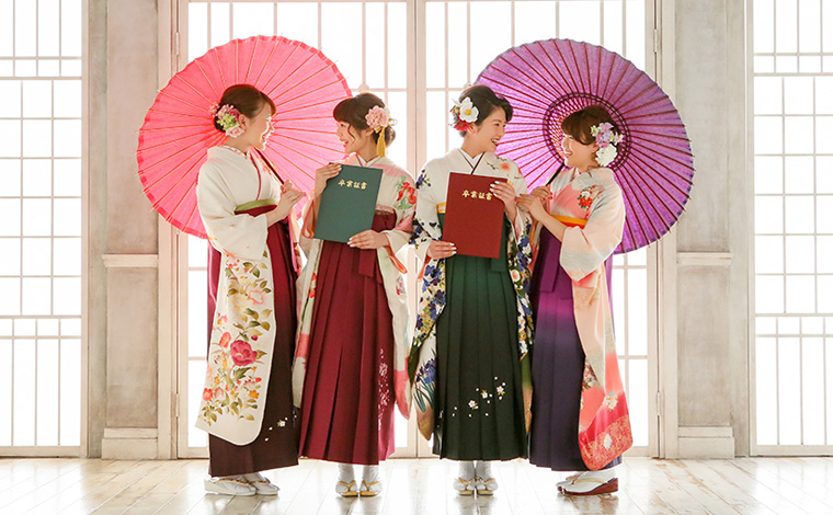 草履もブーツどちらにするか迷ってしまう時は、前撮りと式当日のコーディネートを変えてみましょう。これならイメージの異なる袴美人が2通り体験できます。さらに式当日も、天候や気温を考え、自分に合った履物をお選びください。