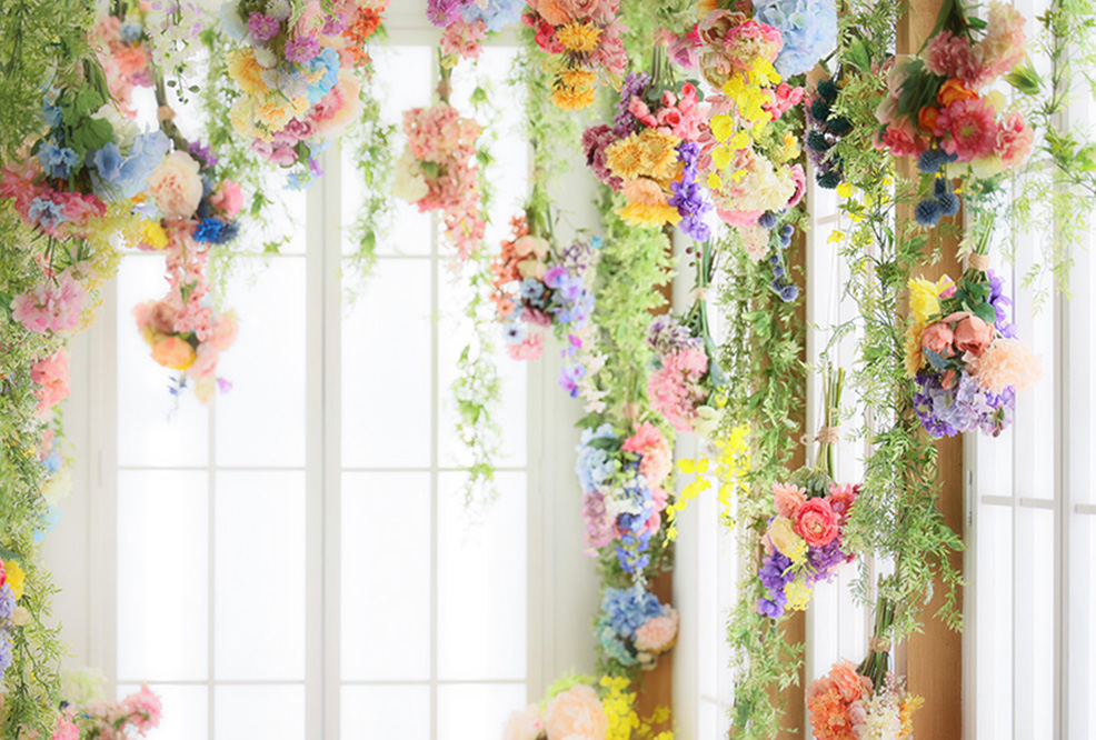 シンプルなロール背景や、クラシックな撮影におすすめのチャペル調の窓背景、ナチュラルな撮影にぴったりの光が差し込むグリーンやお花がいっぱいの背景など、1箇所のスタジオでバリエーション豊富なさまざまなシーンを撮影できます。立体的な背景とライトアップで、インドアロケーションとは思えない美しい一枚を実現します。