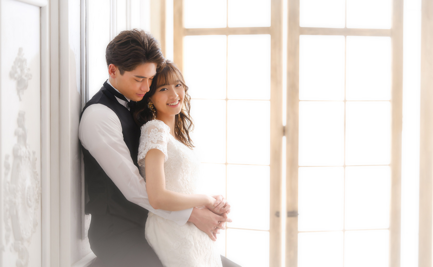 スタジオなら、天候に左右されることなく、スケジュール通りに前撮りができます。緑に彩られたナチュラルテイスト、シックなアンティーク調など多彩な背景を楽しめます。