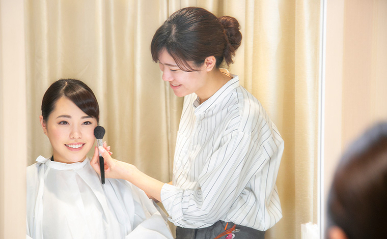 メイクのポイントは上品な美しさと清潔感。しっかりとしたメイクでナチュラルな仕上げを心がけましょう。ハイライトやシェーディングを使って立体感を出すと、きりっとスマートな印象で華やかさも増しますよ。